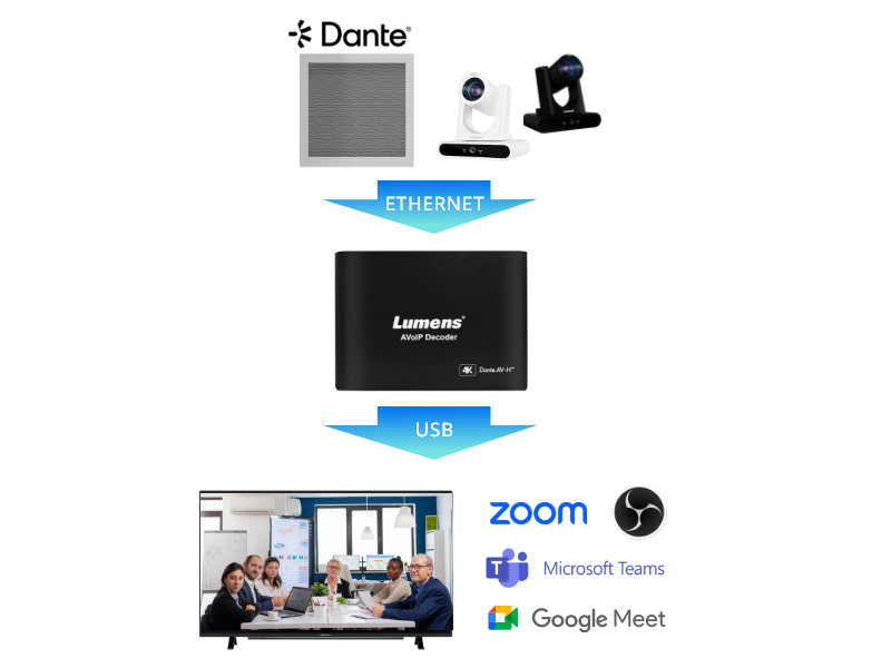 OIP-N60D Dante AV-H encodes IP video streams from RTSP and Dante AV-H to UVC/UAC-compliant USB for use with video conferencing platforms including Teams and Zoom.